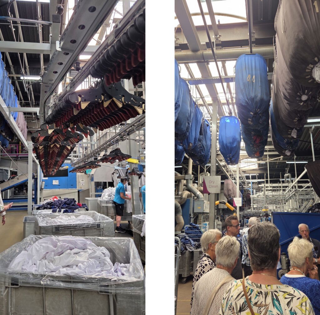 We gaan eerst in drie groepen door de wasserij. We zien hoe de voorgesorteerde zakken met vuile was uit een vrachtwagen aan de rail gaan en door worden geleid naar de benodigde wasmachines. Na het wassen en drogen gaat alles langs een punt waar uitgelezen wordt of herstelwerk nodig is. Er is een rij reparatiestations waar alles met de hand gebeurt. Veiligheidskleding wordt ook gecontroleerd op de mate waarop reflectie-strippen nog werken. Omdat alle kledingstukken een chip en barcode hebben komt alles uiteindelijk weer op de juiste plek bij elkaar om door machines te worden gevouwen en klaargemaakt voor transport. Alles wordt door eigen ICT aangestuurd. Tijdens de rondgang hoorde ik dat de moeder van onze Thea een zus was van de oprichter van het bedrijf. Toch weer een dun lijntje naar Cabauw!