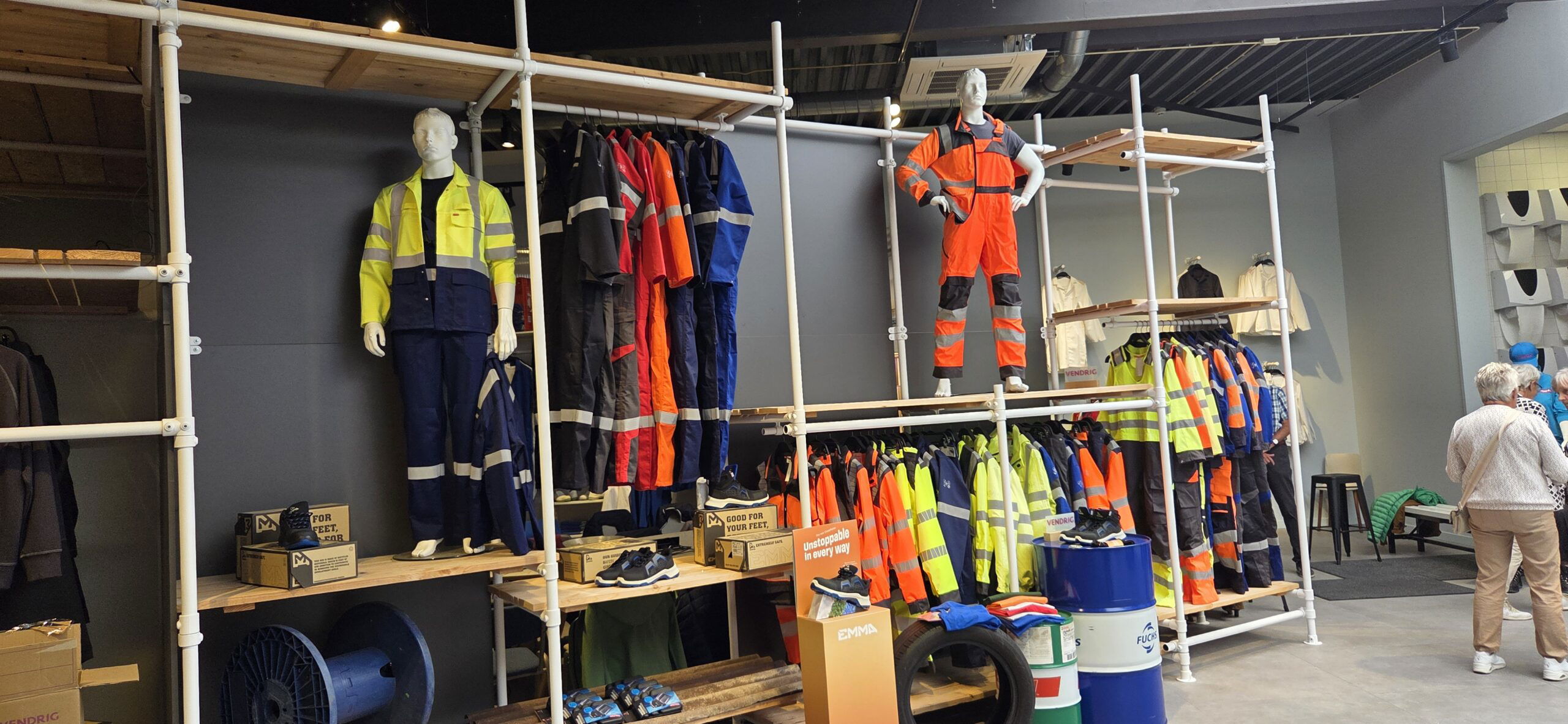 In de grote showroom is te zien hoeveel artikelen wel niet kunnen worden gehuurd. Vendrig koopt bij verschillende leveranciers in, maar heeft ook een eigen lijn. Ervaringen uit het onderhoud worden hier uiteraard bij gebruikt. De keuze uit stoffen, modellen, kleuren is groot. Werkkleding wordt ook steeds meer modegevoelig. Vanuit de toepassing zijn er verschillende eisen, met name voor veiligheidskleding. Veiligheidsschoenen kunnen ook worden geleverd. Bij vroegtijdige teruggave worden ze weer opgeknapt om naar een ander over te gaan.
